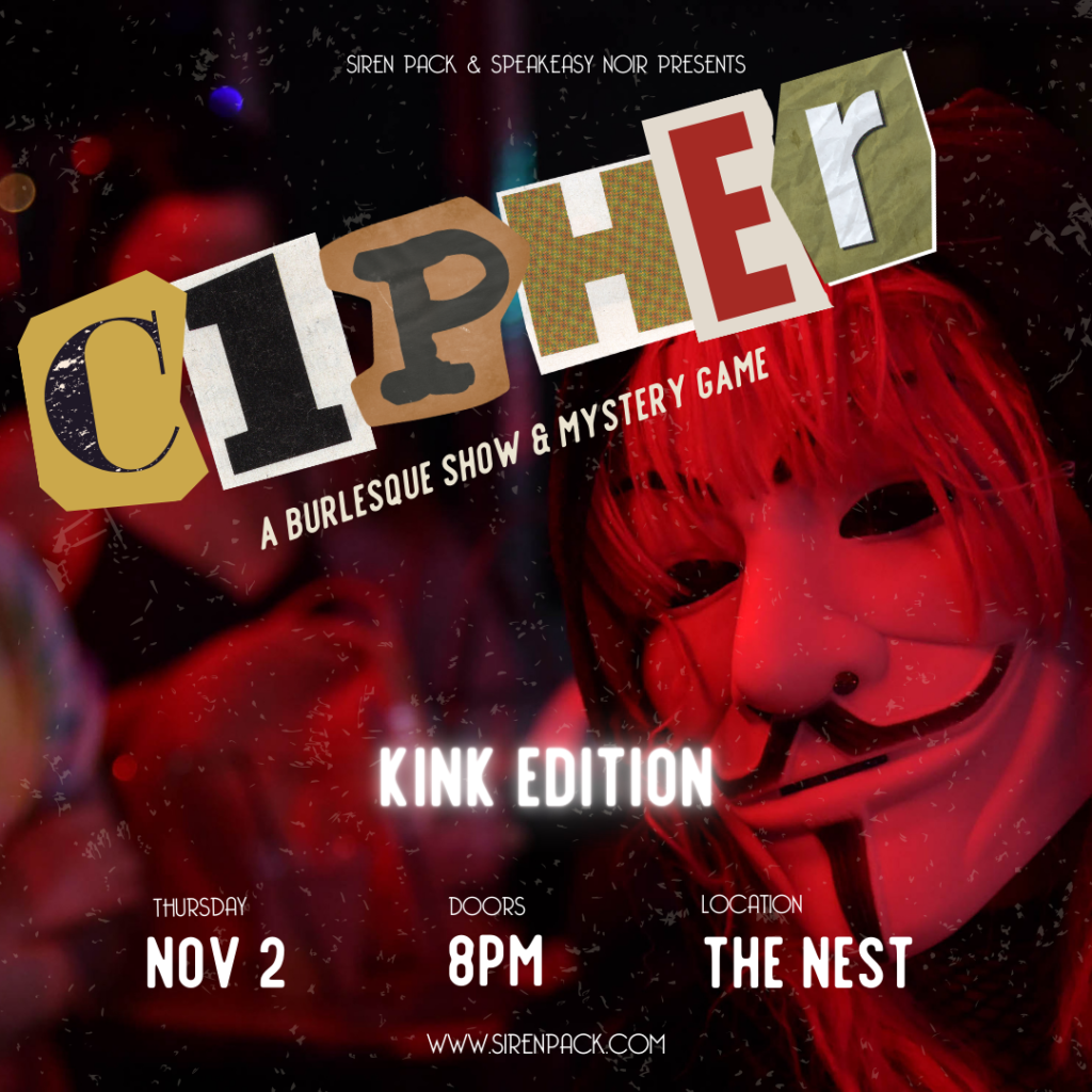 Burlesque, Theater, Kink, Comedy, Improv, Flow Art, Drag, Aerial in an erotic-noir cabaret show. CIPHER is a thrilling and entertaining evening filled with provocative seduction and heart-pounding suspense, where every twist and turn shrouds the truth in shadow. Follow the clues and unravel the mysteries where secrets lie hidden, and desires dance in the darkness. Show elements include Theatre, Burlesque, Sideshow, Cabaret, Flow Arts, Storytelling, Comedy and Improv featuring Emerald Sazerac, MaDda, Cash Calamity, Hydra, Shay Au Lait, Justin the Modern Reader and DJ Honeyblunt. Whether it’s a murder mystery or an art heist, we are all about the psychological thrills of our theatrical burlesque shows. If you enjoy a mind twist and subversive tease, you’ll want to experience our final Philadelphia burlesque show in this limited series. |
